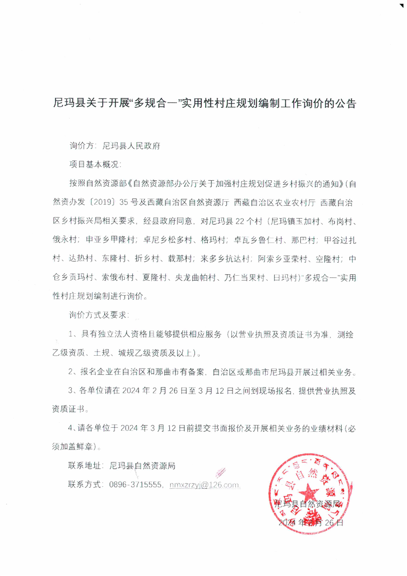 尼玛县关于开展“多规合一”实用性村庄规划编制工作询价的公告